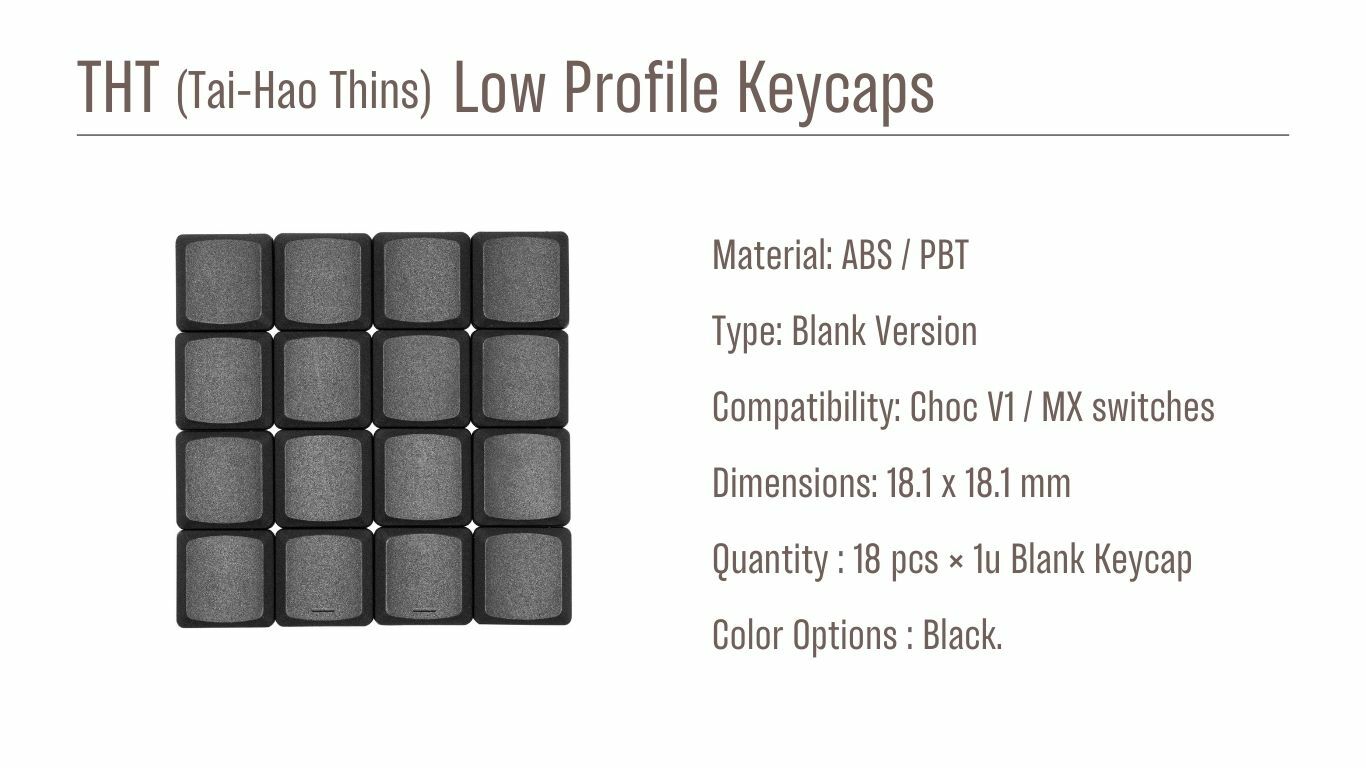 THT (Tai-Hao Thins) Low Profile Keycaps (Blank) - ABS /PBT Black 18PCS (16 blank + 2 homing per set)